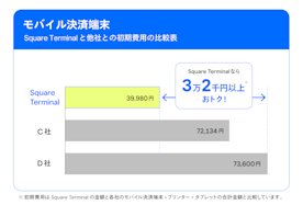 他社のカード決済端末(レシートプリンター内蔵型)や、モバイル決済端末(レシートプリンター、タブレット別売)と比較してもSquare ターミナルなら数万円安く使い始められます。