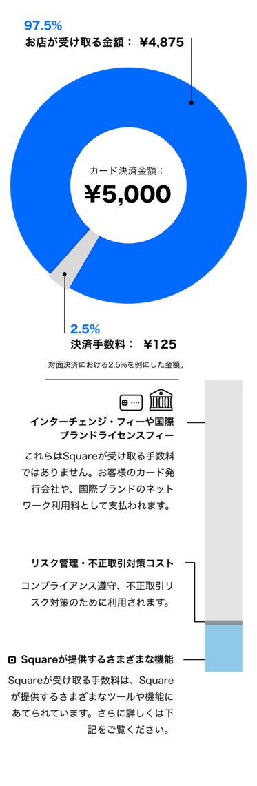 Squareは、決済手数料の透明性を保つことが重要だと考えています。お店でキャッシュレス決済を受け付ける際に発生するキャッシュレス決済手数料のうち、Squareが受け取るのはごく一部です。手数料の大部分は加盟店のビジネスに還元されています。
