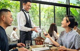 ハンディ端末を使えば、客席や移動販売など、さまざまな場所で注文・決済に対応できます。レストラン内外の幅広い場所でお客さまと向き合うことができます。