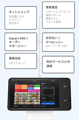Square POSレジのサブスクリプションに、決済端末やハードウェアは含まれていません。Square ショップでは、Square POSレジに対応するさまざまな端末をご用意しています。お店のニーズに合った端末を自由にお選びください。決済端末・ハードウェアのディスカウント(適用対象である場合)については、営業チームにお問い合わせください。Square POSレジは、iPadをはじめ、飲食業界で一般的に使用されるキッチンプリンター、レシートプリンター、キャッシュドロワー、ルーターなど、幅広いハードウェアに対応しているため、すでにお持ちのハードウェア(互換性がある場合)をご利用いただくことも可能です。