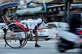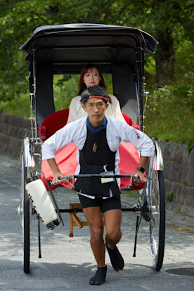 山本さんの俥夫歴は10年。東京の浅草でスタート後、鎌倉、小樽、嵐山で経験を積み、5年前から東山で従事しています。お客さまと過ごすひとときを大切にし、感謝の気持ちで人力車を引いています。