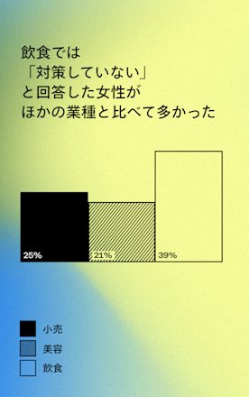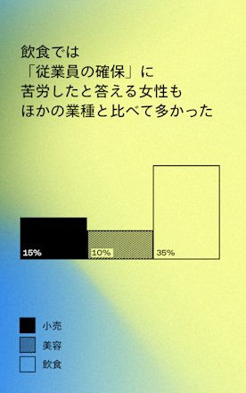 一方、飲食では「対策をしていない」と回答した女性の割合がほかの業種と比べて高いことが分かりました。飲食では他業種よりも「従業員の確保」に苦労したと答える割合が多く、集客に時間を割けるほど人手を確保できていない可能性が考えられます。