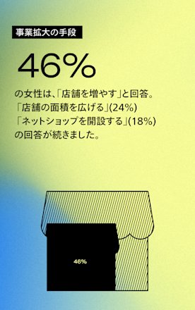 事業を拡大する手段としては、「ネットショップを開設する」など比較的コストがおさえられる方法よりも、コストがかかる「店舗数を増やす」が選ばれる傾向にありました。店舗を増やすことを選んだ女性のうち34%が、「業績がよいから」を事業拡大の理由に挙げていることが影響していると考えられます。