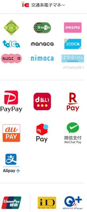 Squareは、Visa、Mastercard、American Express、JCB、Diners Club、Discover、UnionPay (銀聯)などのクレジットカードおよびデビットカードに対応しています。また、今後ますます普及が進むと予想されるタッチ決済も受け付け可能です。QRコード決済は、PayPay、d払い、楽天ペイ、au PAY、メルペイ、WeChat Pay、Alipay+に対応しています。電子マネーは、交通系ICカード(Suica、PASMO、Kitaca、TOICA、manaca、ICOCA、SUGOCA、nimoca、はやかけん)、iD、QUICPayに対応しています。現時点では、タクシーやハイヤーなどでの電子マネー決済には対応していません。また、PiTaPaもご利用になれません。