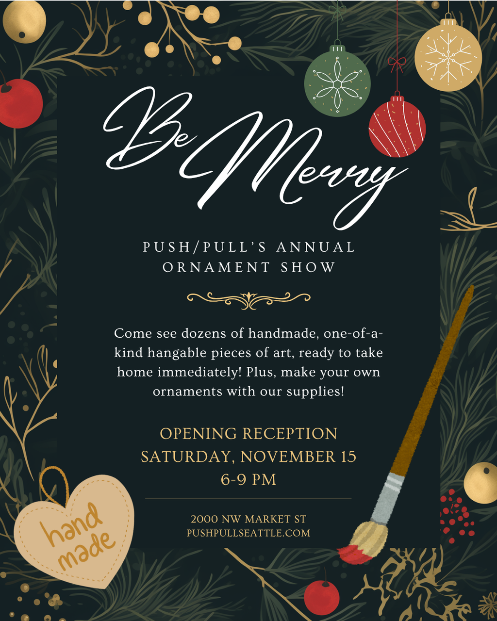 Saturday, November 15, 6:00 PM: It's the Opening Reception for Be Merry, our annual ornament show featuring dozens of handmade hangable art for your walls, trees, fireplace, and other fixtures! These pieces are available for immediate take-home, so come see them (and claim them) before they find homes elsewhere! 🎋