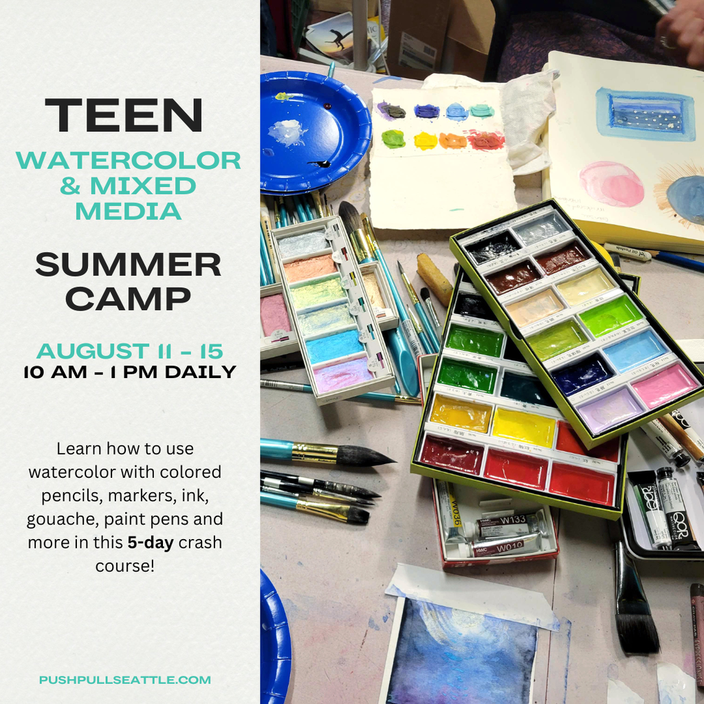 We're coming up on the FINAL summer camps of the year, the Watercolor & Mixed Media Camp, with separate tracks for Teens and for Adults. The weeklong series runs August 11-15, but both the Teen and Adult series needs a few more registrants by August 4 in order to meet minimums.