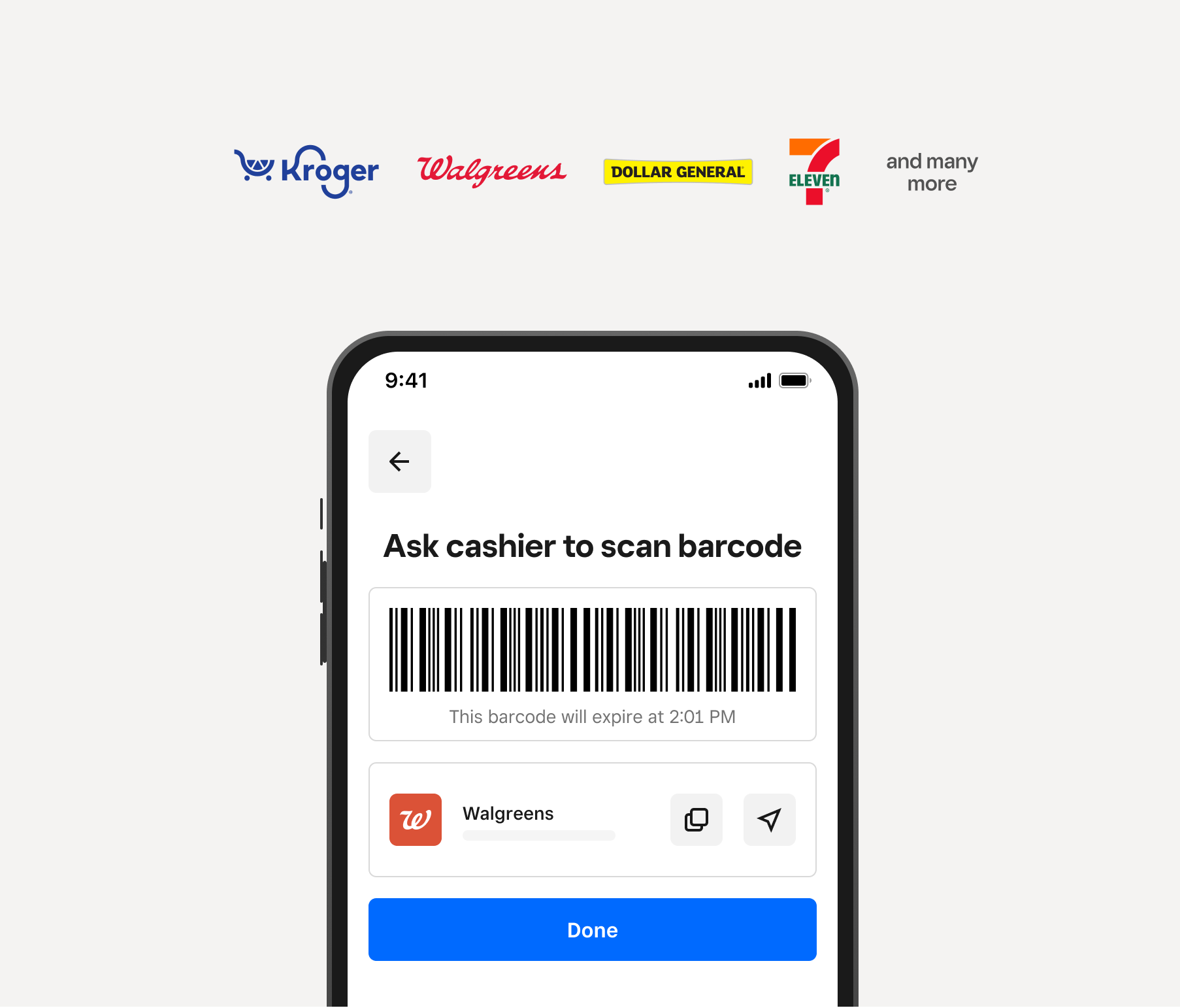 Easily add cash to your account for free at stores, like Kroger®, Walgreens, Dollar General, and 7-Eleven. Deposits are available in minutes.⁵