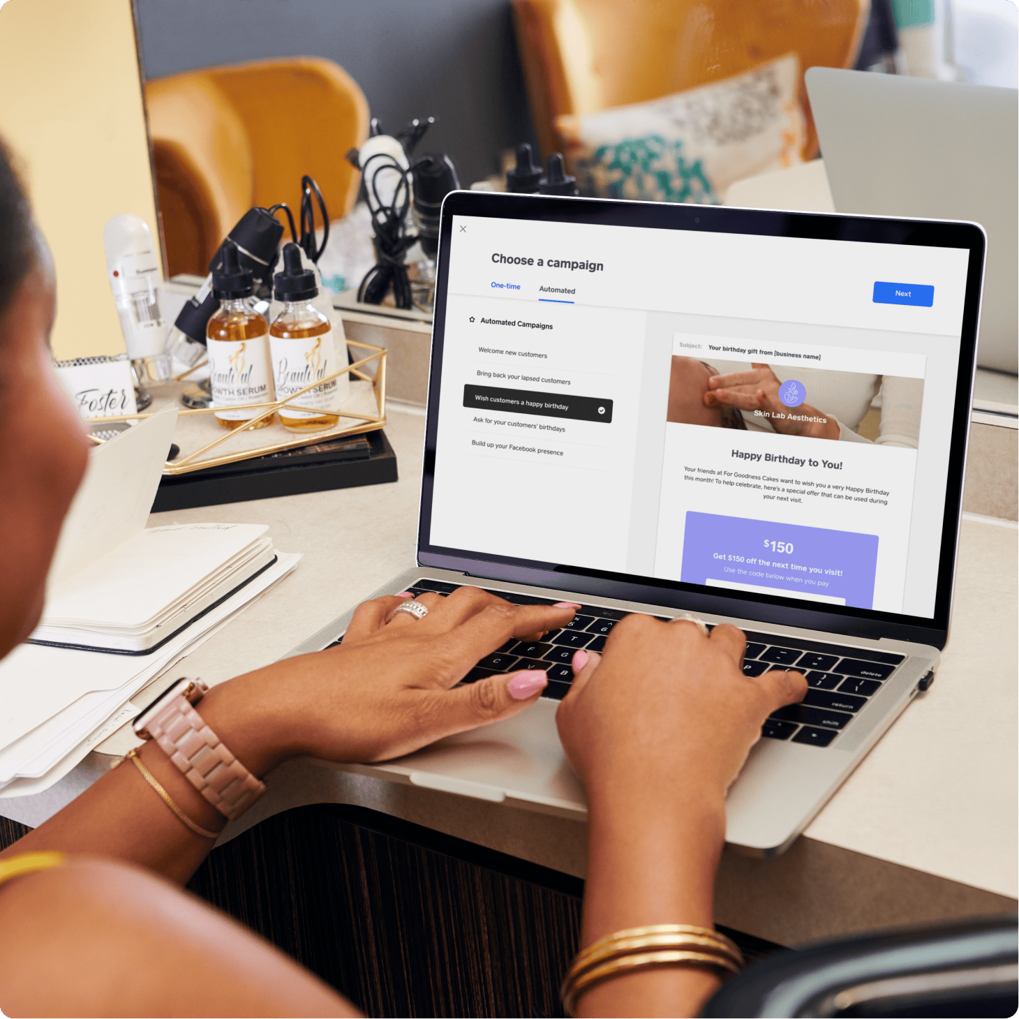 Manage your inventory and sell eye masks, skincare essentials, and other retail items online with a customizable eCommerce website or in-store. Plus, secure revenue upfront by selling packages of services.