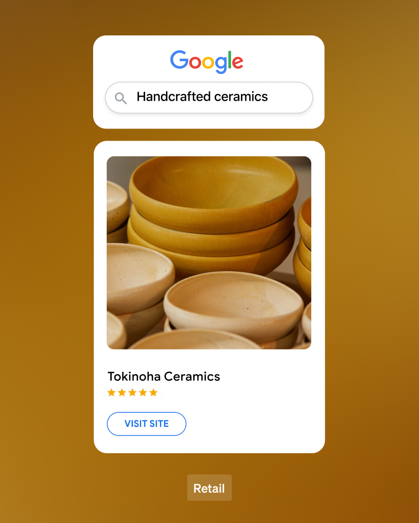 Make your retail catalog discoverable across multiple Google surfaces and close the sale on your site.