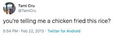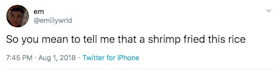 Then, in 2018, @emiilywrld went viral by expanding the discussion to shrimp: So you mean to tell me that a shrimp fried this rice?^