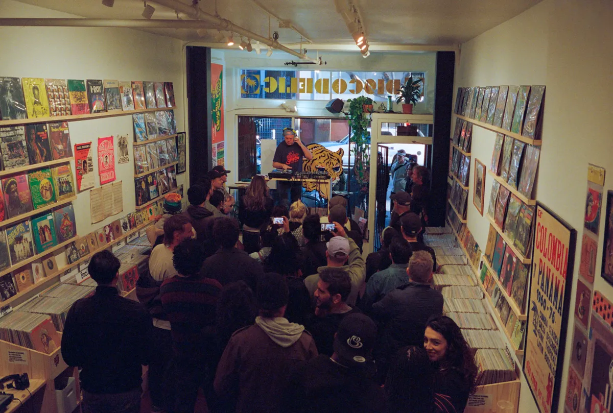 As you walk in through the doors to San Francisco record shop Discodelic, you’ll likely be greeted by 1970s-era Latin Rock, cumbia, or salsa, playing over the speakers, the sound spilling into 24th Street. Inside the shop everything is vibrant and colorful, the walls adorned with original artwork, vintage posters, and a display of Bolivian silkscreen covers you can literally feel.