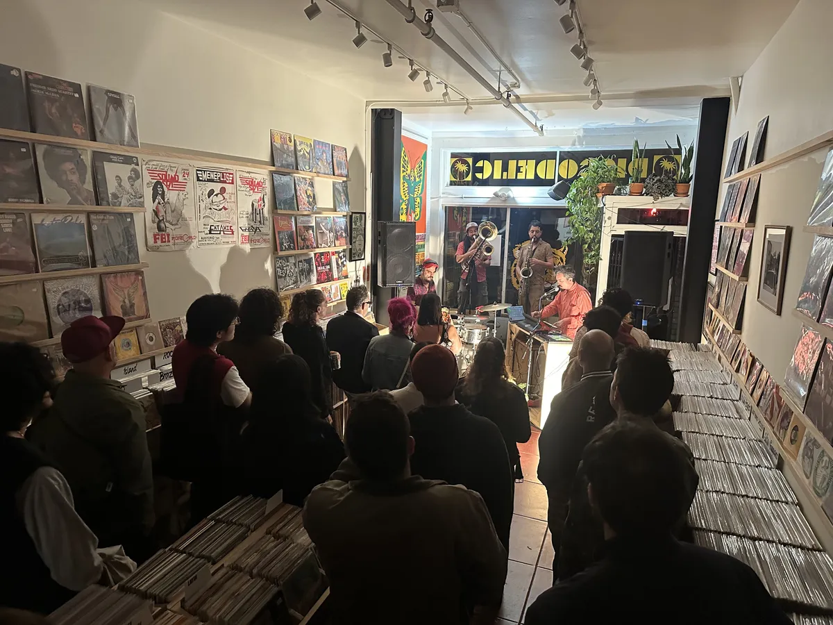 Discodelic co-owners Ruben Rangel, Maria Jose (Majoo) Salguero, and Miles Ake have created a place where this mission comes to life. The business started over 10 years ago, first as a brick-and-mortar location in El Salvador, then Guatemala, and finally Mexico City. Today, its first U.S. outpost sits in the Mission neighborhood of San Francisco in 2023. This journey inspired the slogan, “Discos Viajantes de Otras Dimensiones” (“Traveling Vinyl Discs from Other Dimensions”).