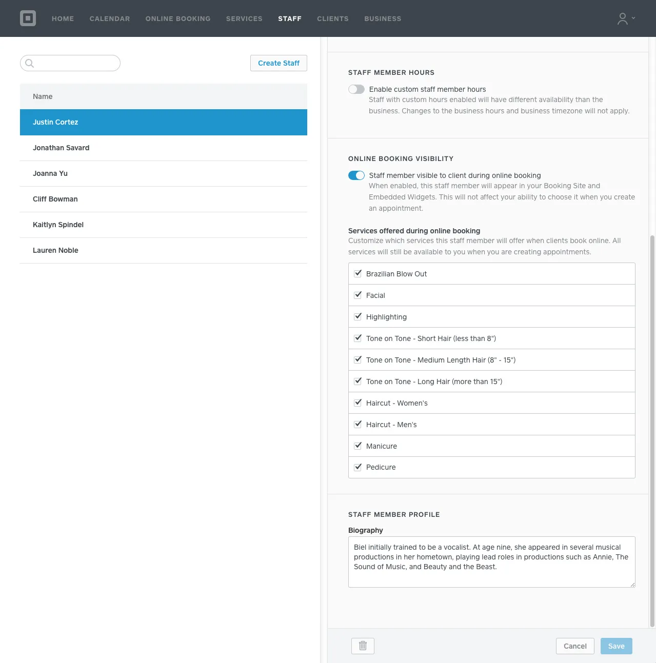 Similarly, to enable or disable a staff member’s online booking visibility, simply visit the Staff section, select a staff member, and disable Online Booking Visibility. You can also select which services that staff member offers: