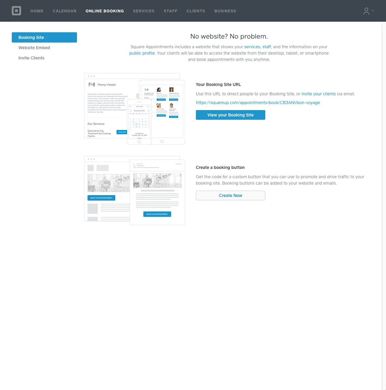 Square Appointments is an online booking website, right out of the box. You can use it as your primary website or link to it from wherever you want (your existing website, email, social media, etc). To preview your booking site and get its URL, go to the Online Booking section.