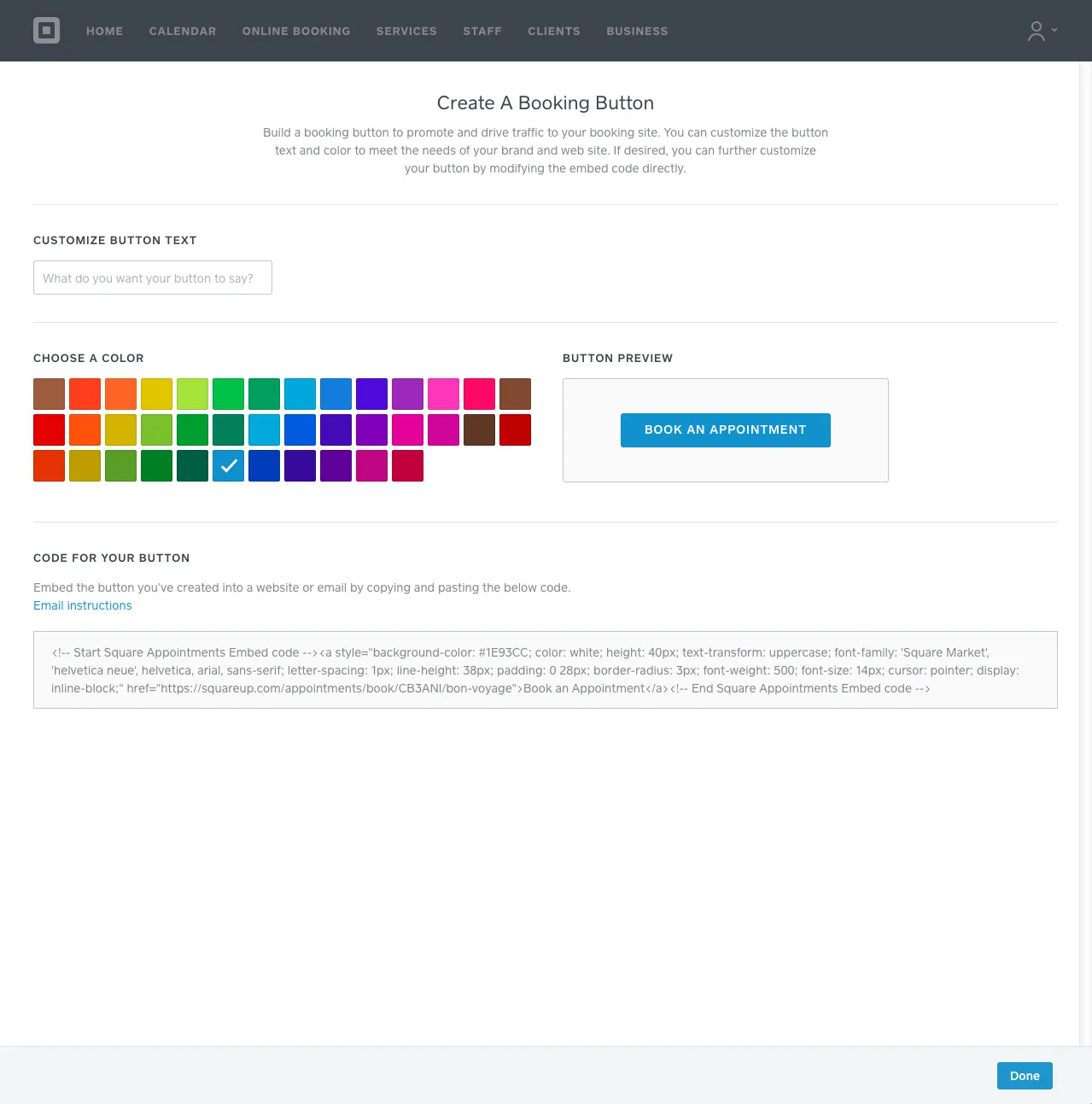 Booking buttons are a great way to promote online booking from anywhere on the web. When prospective clients click on your booking button, they’ll land on your site to book an appointment. And now you have the ability to control the color and copy used on your booking buttons to match your brand.