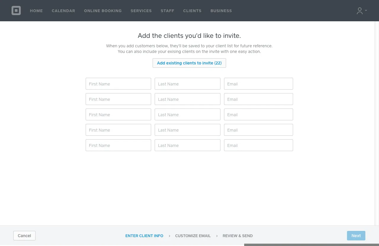 You can start the process from the Invite Clients section under Online Booking. Add your existing client list to the recipients list, or type in specific clients to include: