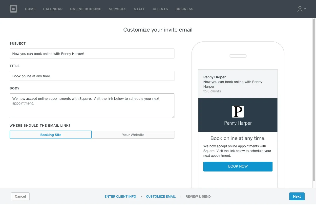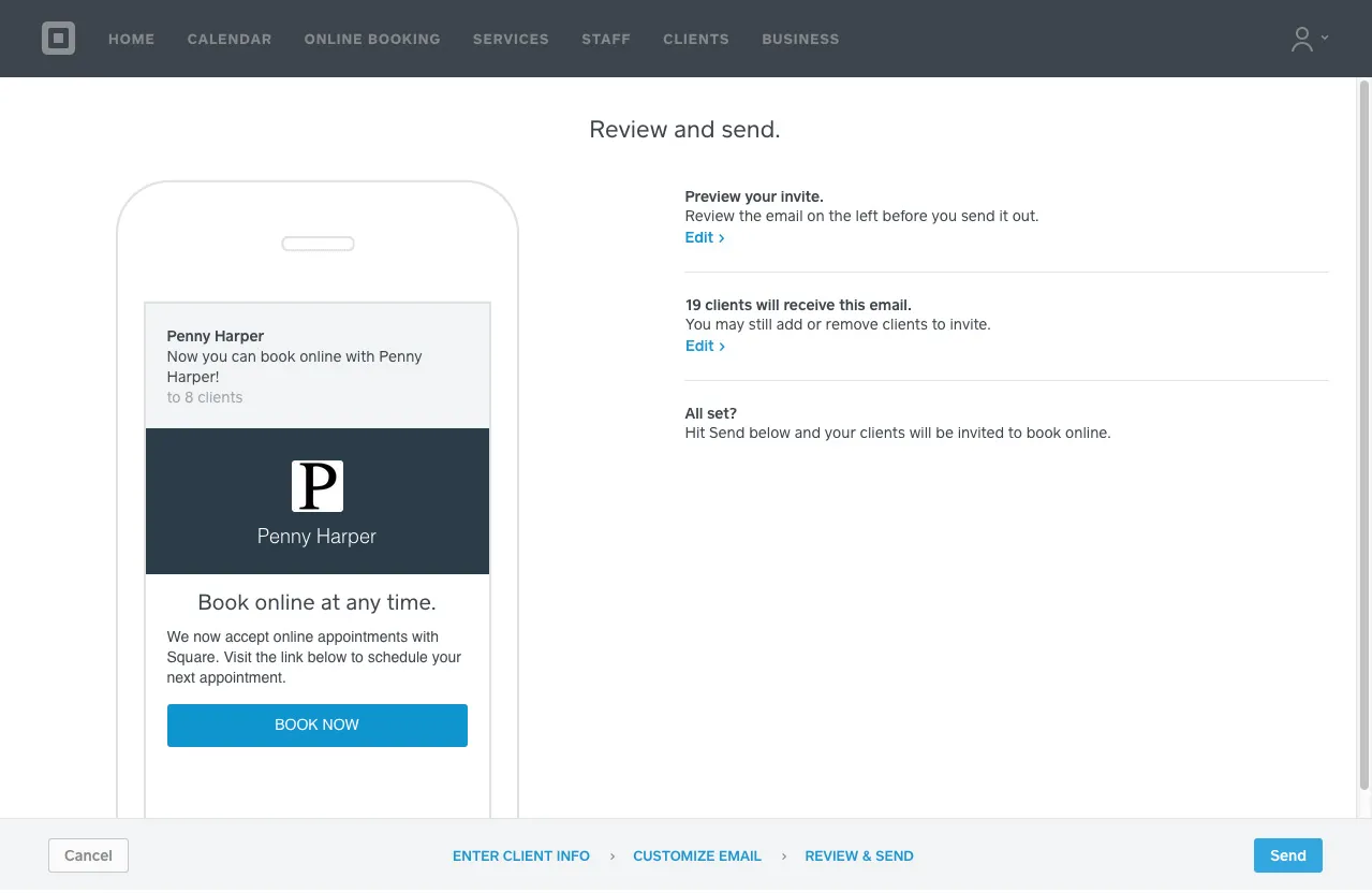 Review the details and hit Send. Your clients will be booking online with you in no time.