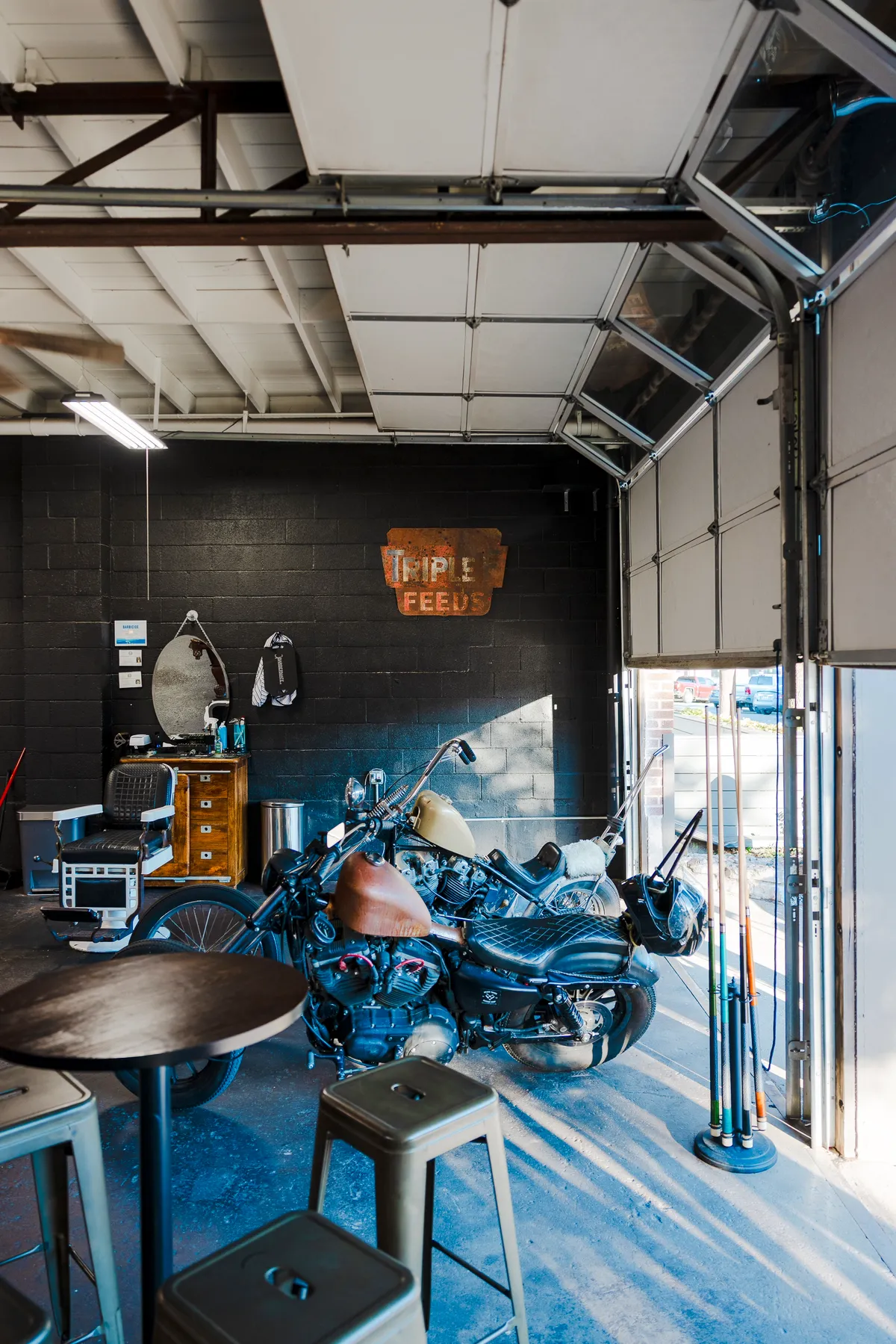 Starting with just one chair in a 600-square-foot space, he began building what would become Brass Tacks. But while the shop started with traditional barbershop aesthetics, White’s personal passions would soon reshape its identity. “I’d always wanted a motorcycle. When I first made money, that was the first thing I bought, so I just went down the rabbit hole of motorcycles and just became obsessed with that culture.”