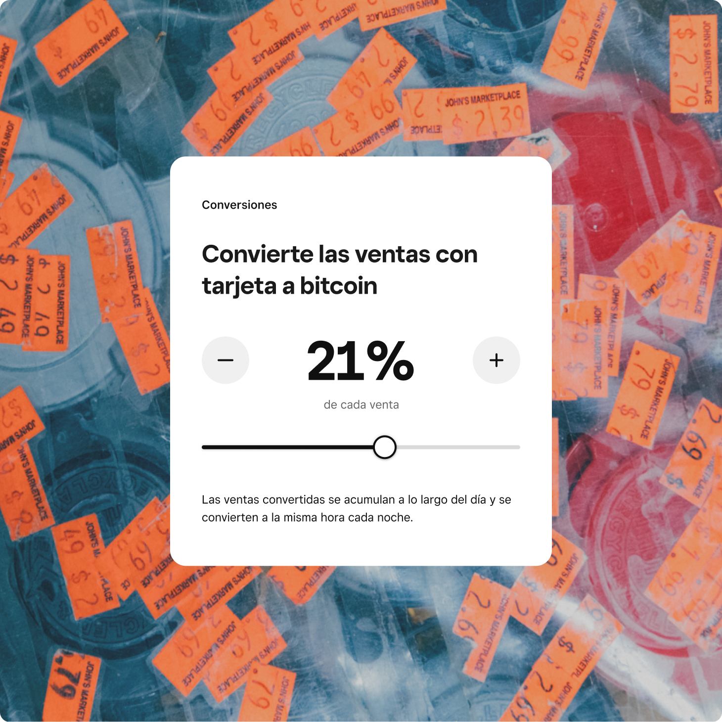 Activa las conversiones a bitcoin: selecciona un porcentaje de tus ventas diarias para convertirlas automáticamente a bitcoin.