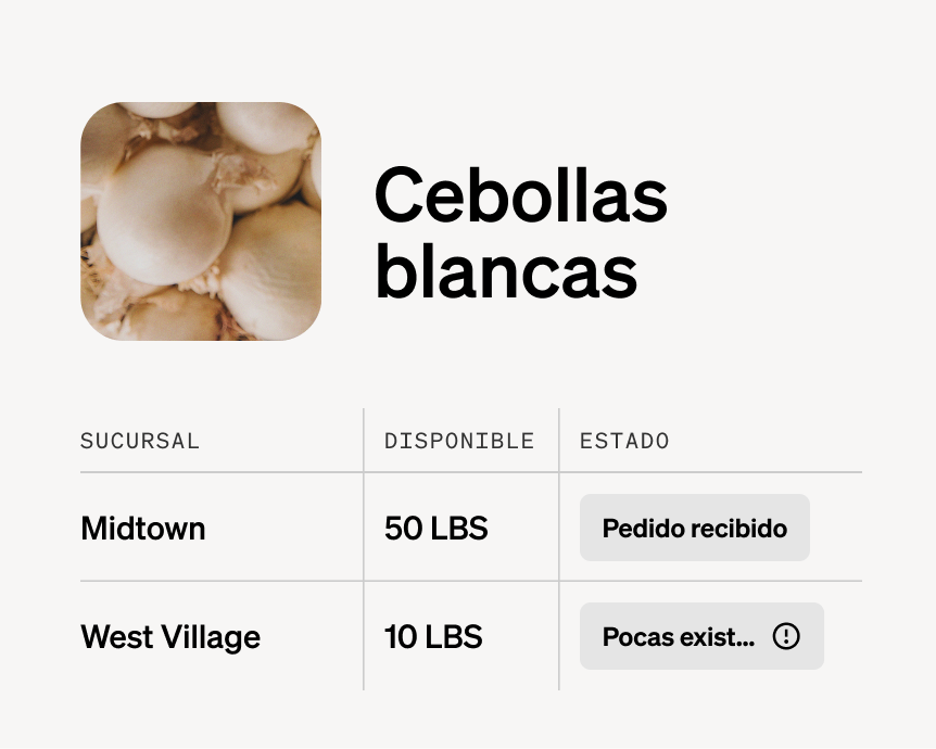 Consulta el inventario de todos tus restaurantes desde un solo panel de datos, para que puedas tomar decisiones sobre transferencias y pedidos al instante.