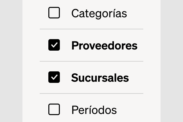 Configura informes según las necesidades de tu negocio, usando filtros por proveedores, períodos de tiempo, categorías y más.