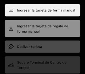Puedes aceptar tarjetas de crédito y débito,tarjetas de regalo Square y registrar pagos en efectivo con enlaces de pago por mensaje de texto. Tus clientes pueden usar Afterpay y otras carteras digitales como Cash App, Google Pay, y Apple Pay.