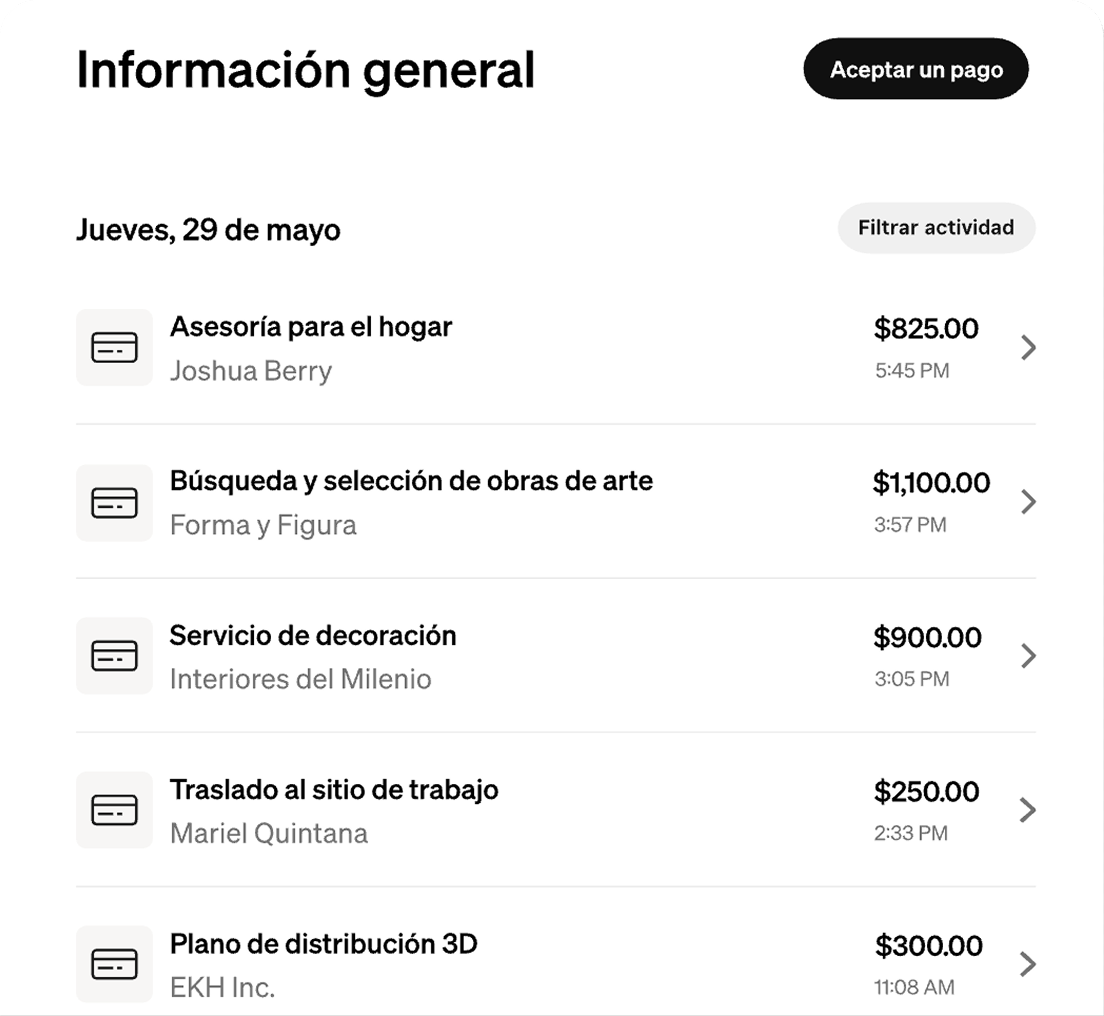 Puedes aceptar tarjetas de crédito y débito o realizar el cobro a una tarjeta guardada.